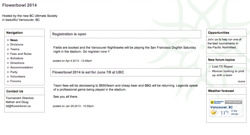 Flowerbowl 2014 will be held at UBC June 7/8, team fees are $650. Vancouver’s largest adult ultimate tournament will once again showcase 4 divisions; elite open, elite women’s, open, and women’s. All the details are at flowerbowl.ca