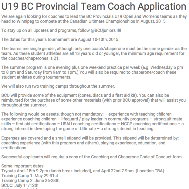 We are again looking for coaches to lead the BC Provincials U19 Open and Womens teams as they head to Winnipeg to compete at the Canadian Ultimate Championships in August, 2015.
